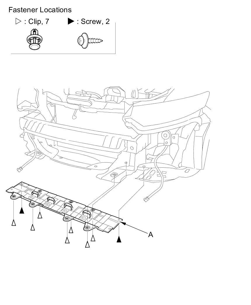2. Remove the clips and the screws, then remove the front bulkhead lower cover (A).