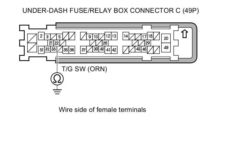 7. Check for continuity between under-dash fuse/relay box connector C (49P) terminal No. 22 and body ground.
