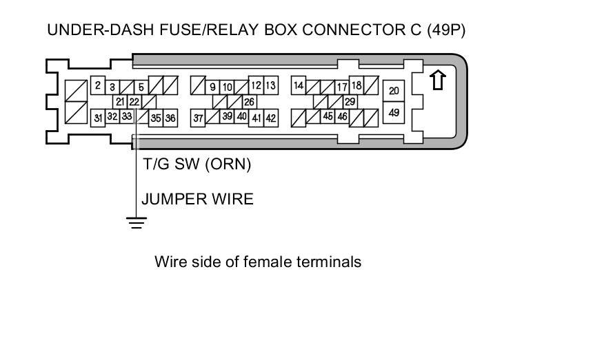 12. Connect under-dash fuse/relay box connector C (49P) terminal No. 22 and body ground with a jumper wire.