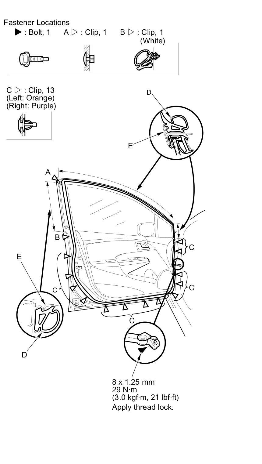 2. Detach the clips (A, B, C), then remove the door weatherstrip (D).