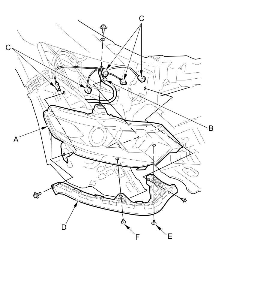 5. Remove the bolt (E) and the screw (F), then separate the corner upper beam and the headlight.
