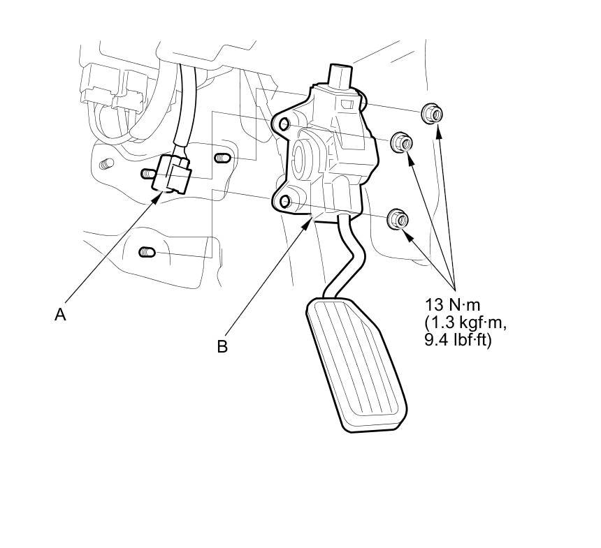 3. Remove the accelerator pedal module (B).