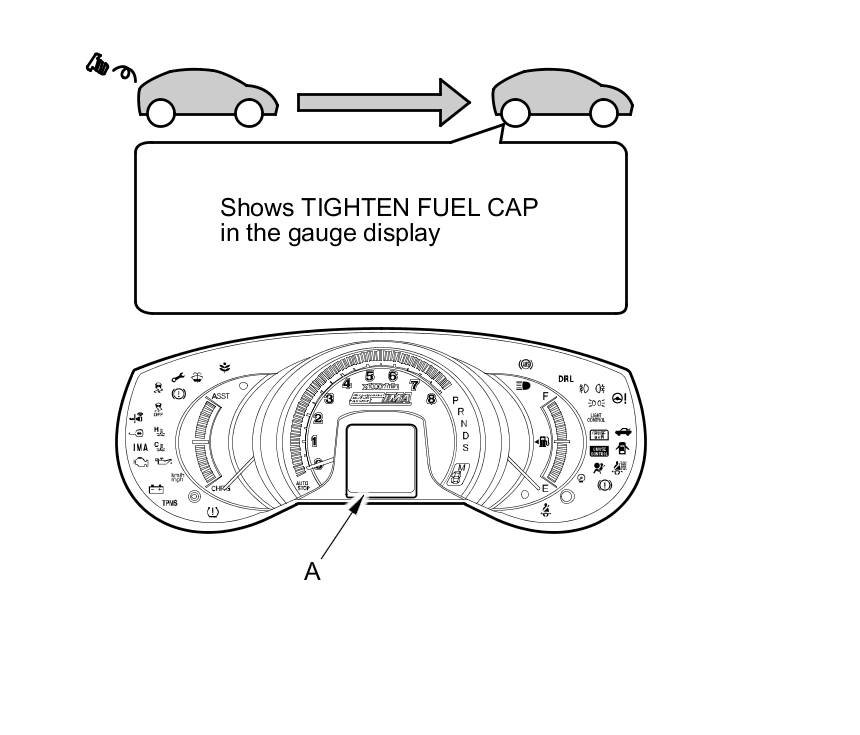 The first time a leak is detected, a TIGHTEN FUEL CAP message appears in the gauge display (A). To scroll to another message, press the select/reset button. The TIGHTEN FUEL CAP message appears each time you restart the engine until the system turns the message off.