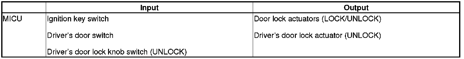 The MICU controls the door lock actuators LOCK, UNLOCK, DRIVER'S UNLOCK, HATCH UNLOCK based on B-CAN door lock switch signals.