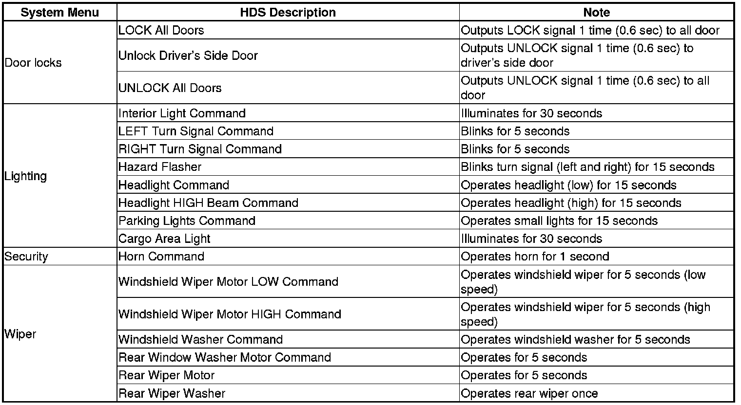 By connecting the HDS to the data link connector (DLC), the HDS can retrieve the diagnostic information from the MICU via a diagnostic line called the K-LINE. The K-LINE is a separate communication line from the CAN lines, but it is connected to most of the CAN related ECUs. The MICU is a gateway between the HDS and B-CAN related ECUs, and sends B-CAN diagnostic information to the HDS. When doing a function test with the HDS, the HDS sends an output signal through the K-LINE to the MICU. The MICU either relays the request to another ECU, or commands the function itself.