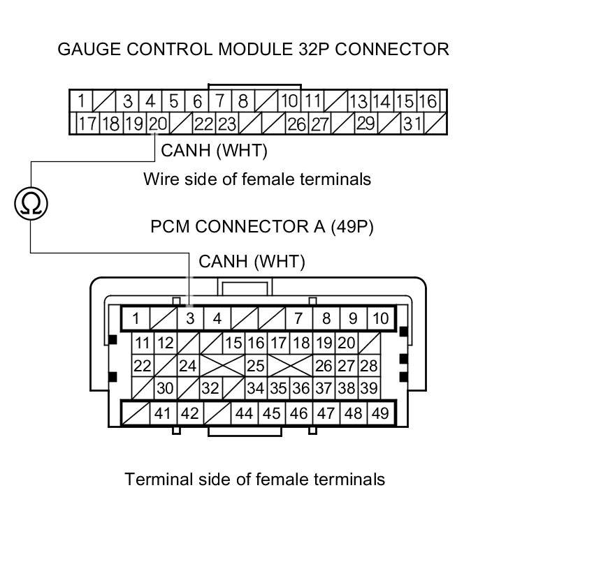 7. Check for continuity between PCM connector terminal A3 and gauge control module 32P connector terminal No. 20.