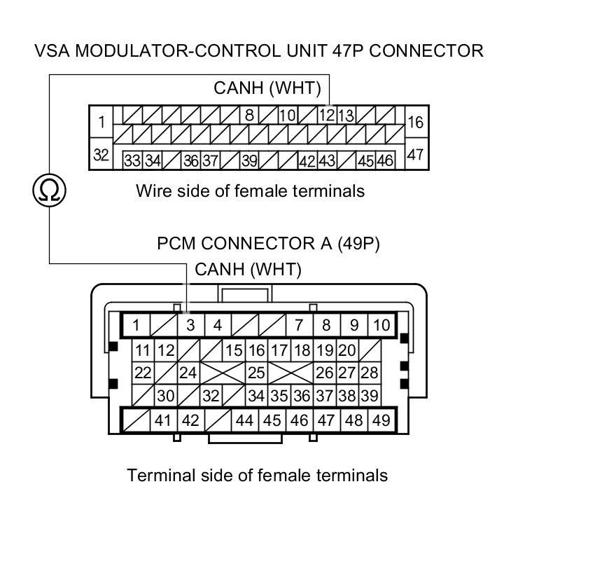 8. Check for continuity between PCM connector terminal A3 and VSA modulator-control unit 47P connector terminal No. 12.