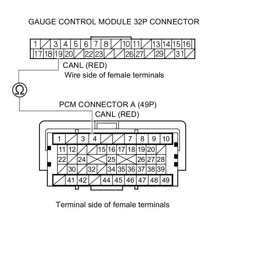 10. Check for continuity between PCM connector terminal A4 and gauge control module 32P connector terminal No. 19.