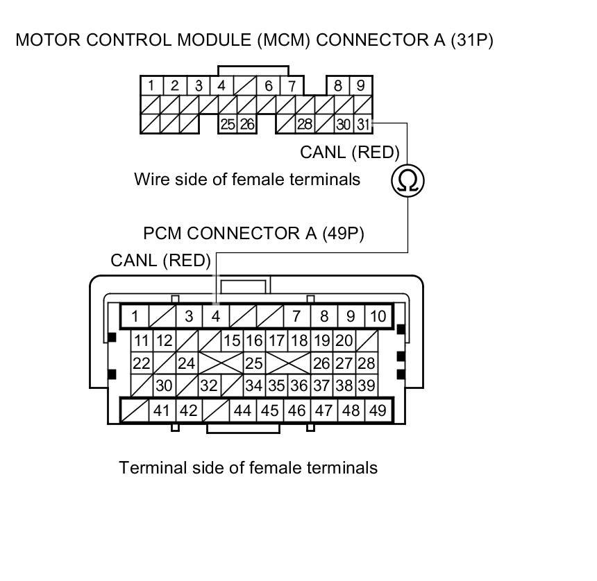 12. Check for continuity between PCM connector terminal A4 and motor control module (MCM) connector A (31P) terminal No. 31.