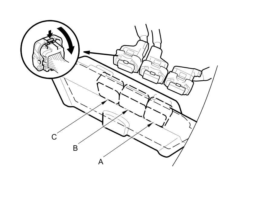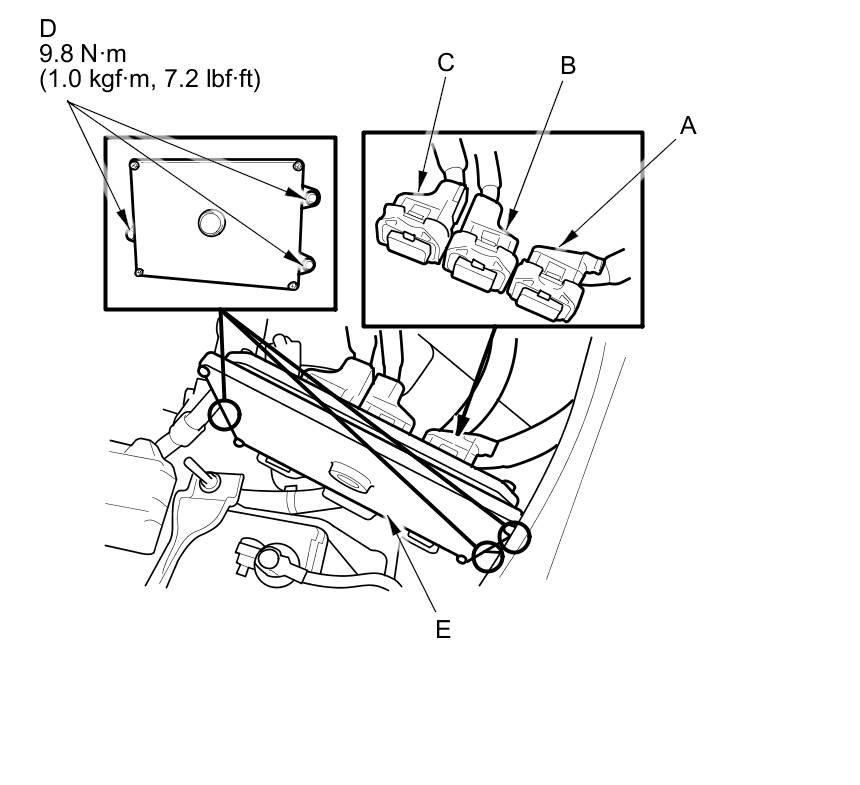 11. Disconnect PCM connectors A, B, and C, then remove the PCM (E).
