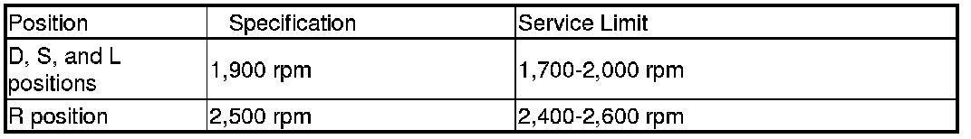 9. Shift the shift lever to D while pressing the brake pedal firmly, then press the accelerator pedal to the floor for 6 to 8 seconds, and note the engine speed. Do not move the shift lever while raising the engine speed.