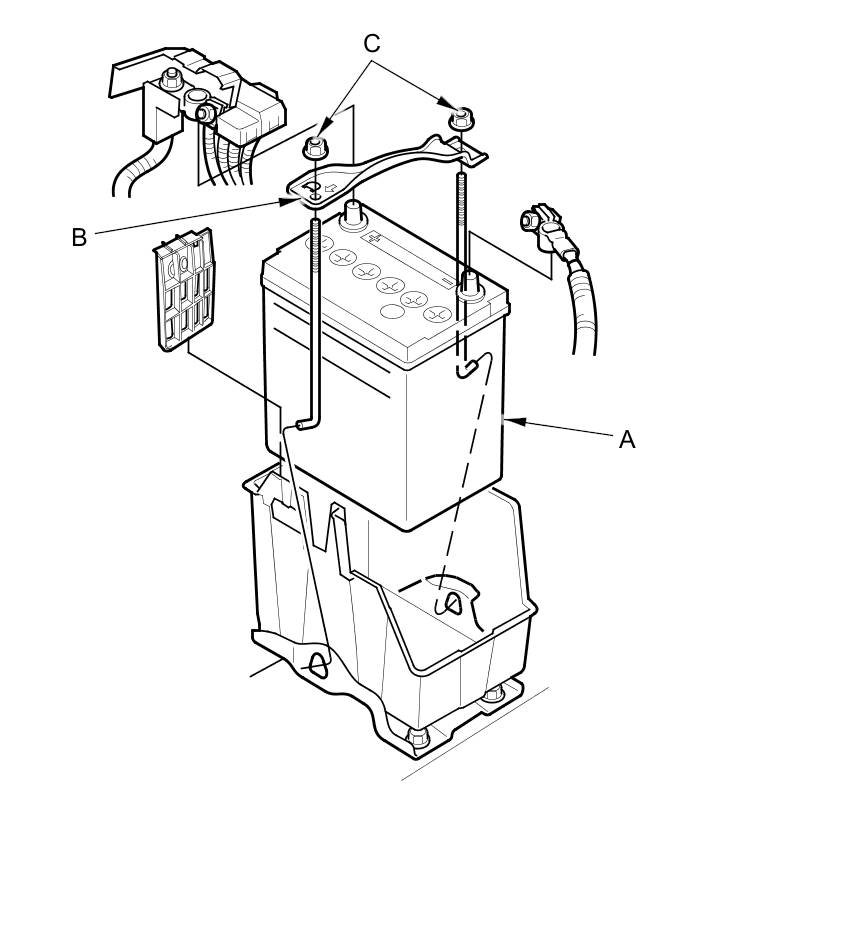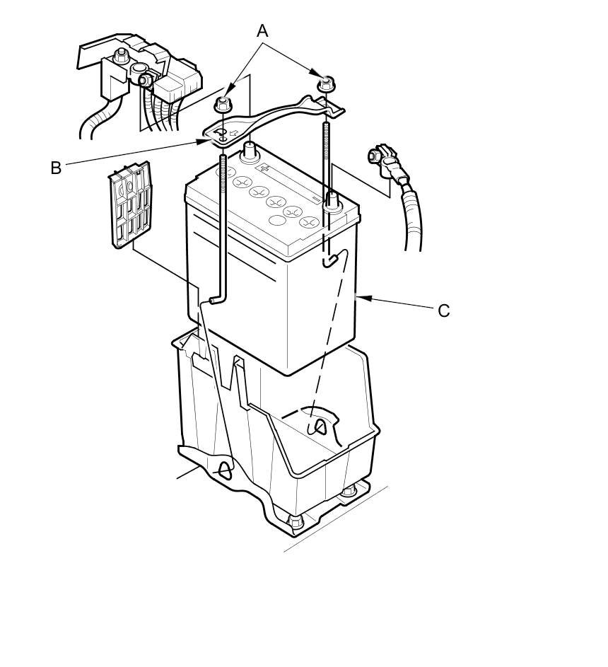 2. Remove the two nuts (A) securing the battery hold down plate (B), then remove the battery setting plate and the battery (C).