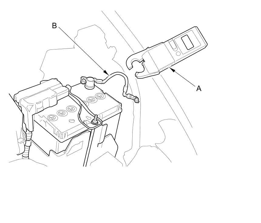 10. Attach the LH41 AC/DC low current clamp meter (A) to the battery ground cable (B). Following the equipment manufacturer's instructions, then measure the parasitic draw.