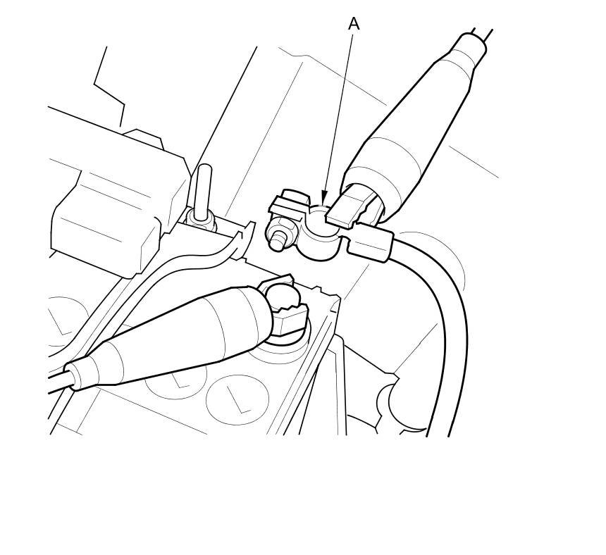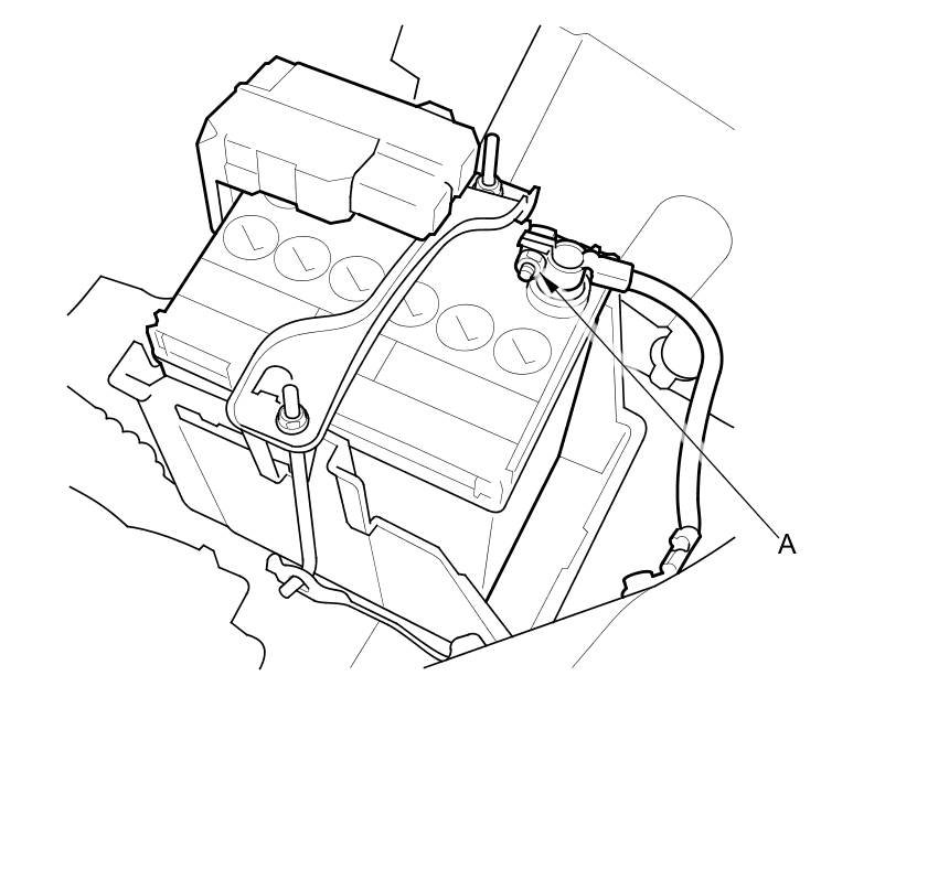 15. Disconnect the negative terminal (A) of the battery ground cable from the battery negative terminal.