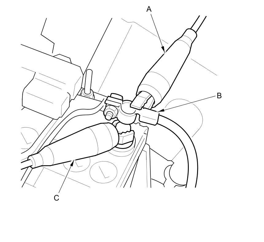 14. Slide the negative terminal of the battery ground cable upwards from the battery negative terminal post to avoid misconnection. Then connect the black (-) test lead (C) to the battery negative terminal post.