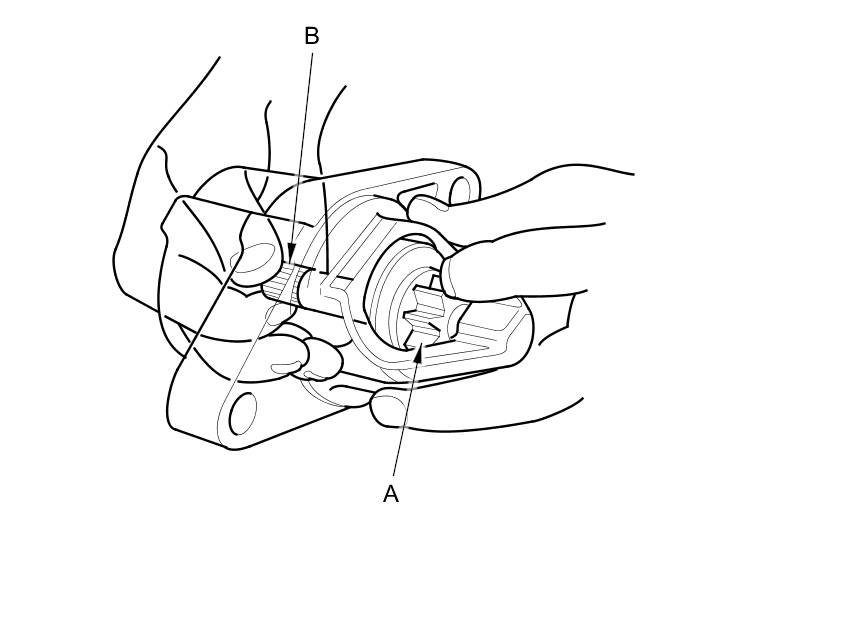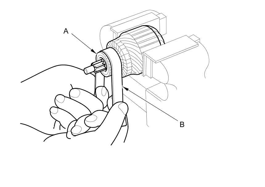 13. Holding the drive gear (A), turn the gear shaft (B) clockwise. Check that the drive gear comes out to the other end. If the drive gear does not move smoothly, replace the gear cover set.