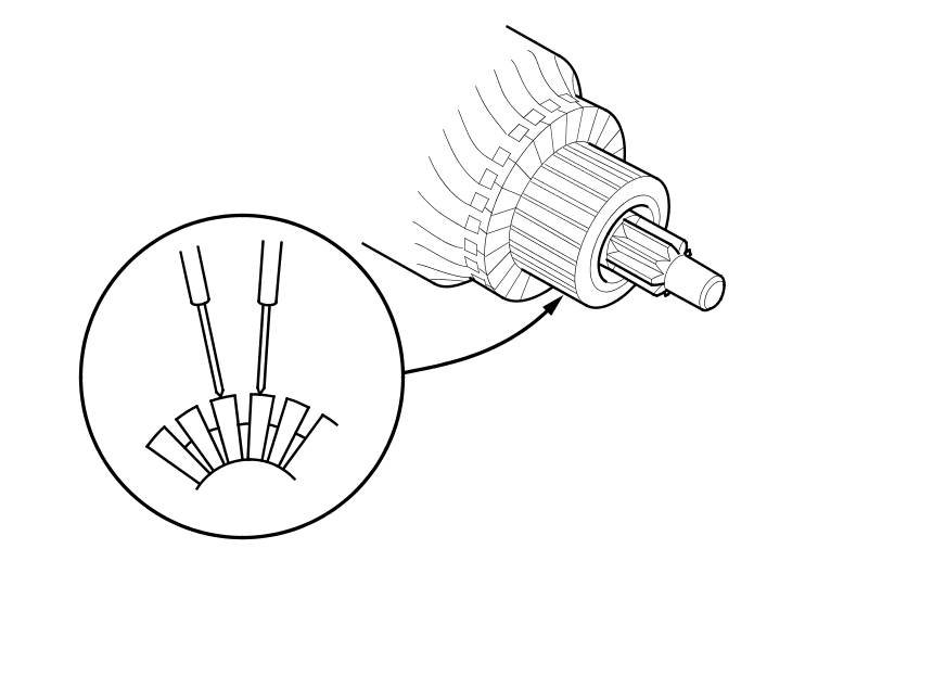 7. Use an ohmmeter to check for continuity between the segments of the commutator. If there is an open circuit between any segments, replace the armature.