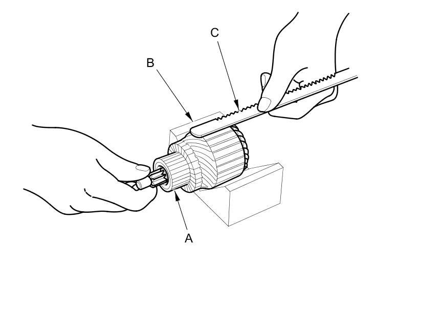 8. Place the armature (A) on an armature tester (B). Hold a hacksaw blade (C) on the armature core. If the blade is attracted to the core while the core is turned, the armature is shorted. Replace the armature.
