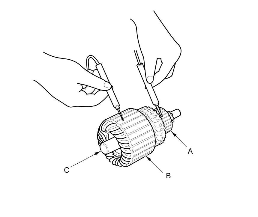9. Use an ohmmeter to check for continuity between the commutator (A) and the armature coil core (B), and between the commutator and the armature shaft (C). If there is continuity, replace the armature.