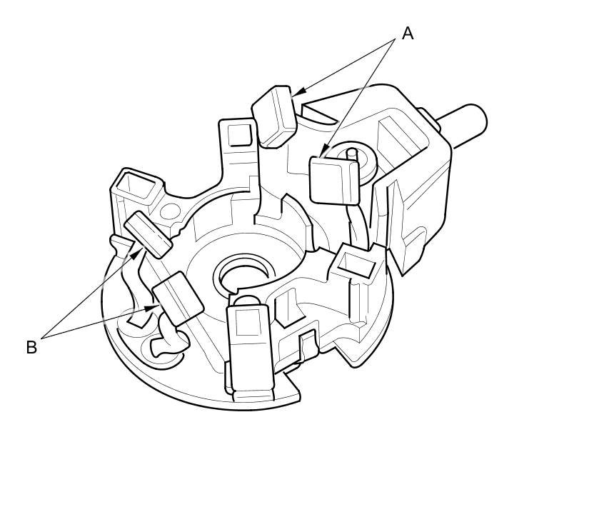 11. Check for continuity between the (+) brushes (A) and the (-) brushes (B). If there is continuity, replace the brush holder assembly.