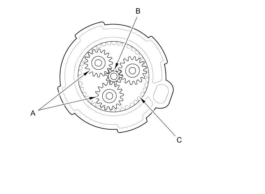 12. Check the planetary gears (A), the armature shaft gear (B), and the internal ring gear (C). Replace them if they are worn or damaged.