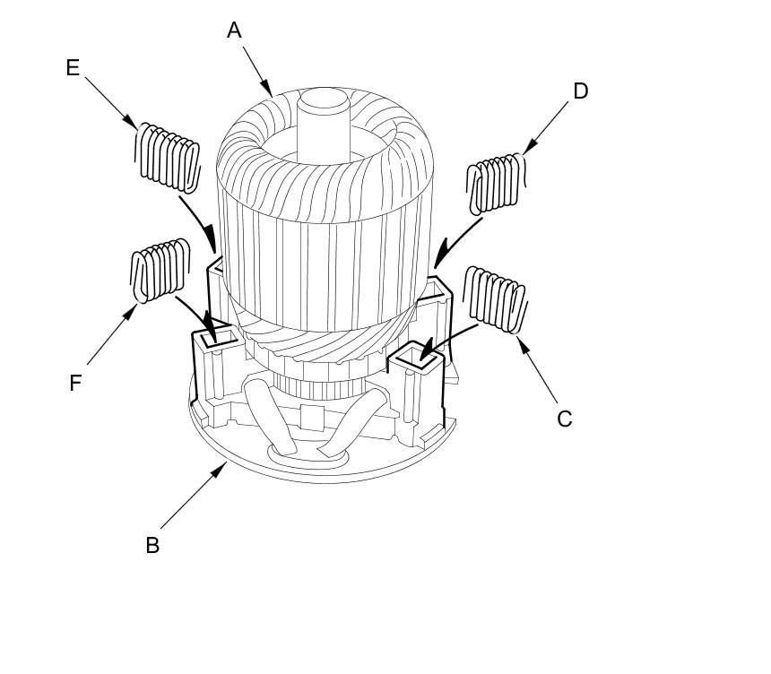 17. While squeezing a brush spring (C), insert it in the hole on the brush holder, and push it until it bottoms. Repeat this for the other three brush springs (D, E, and F).