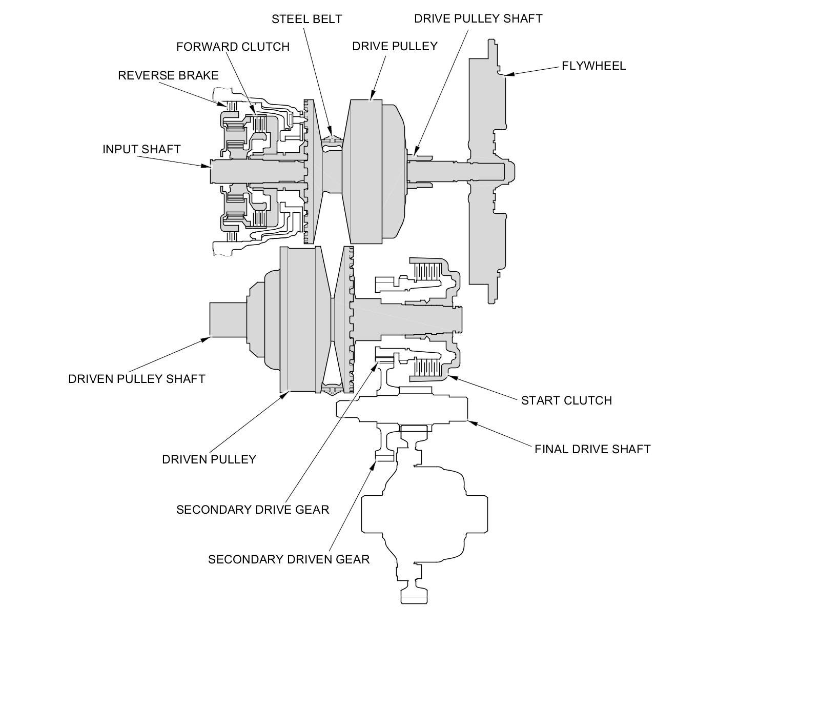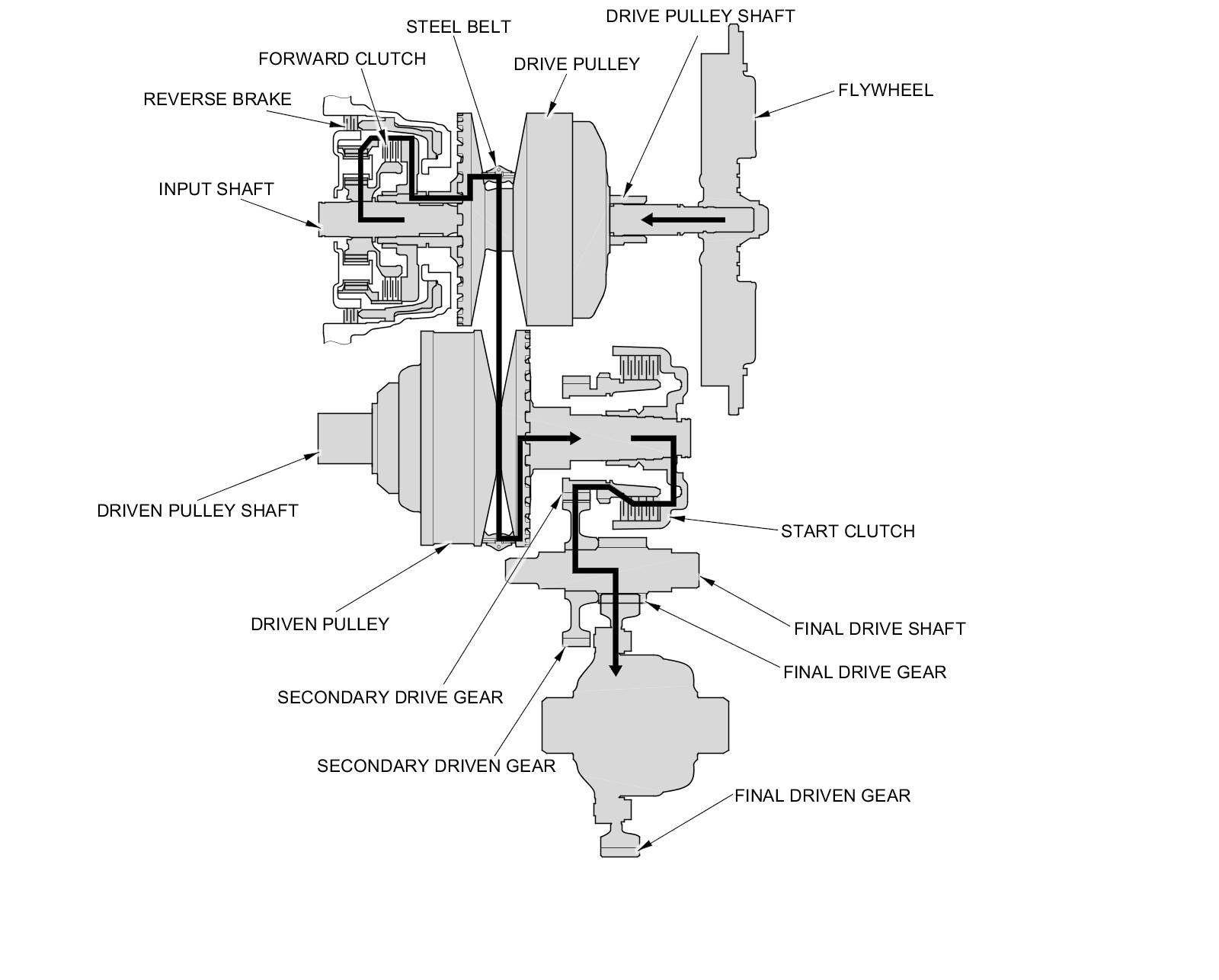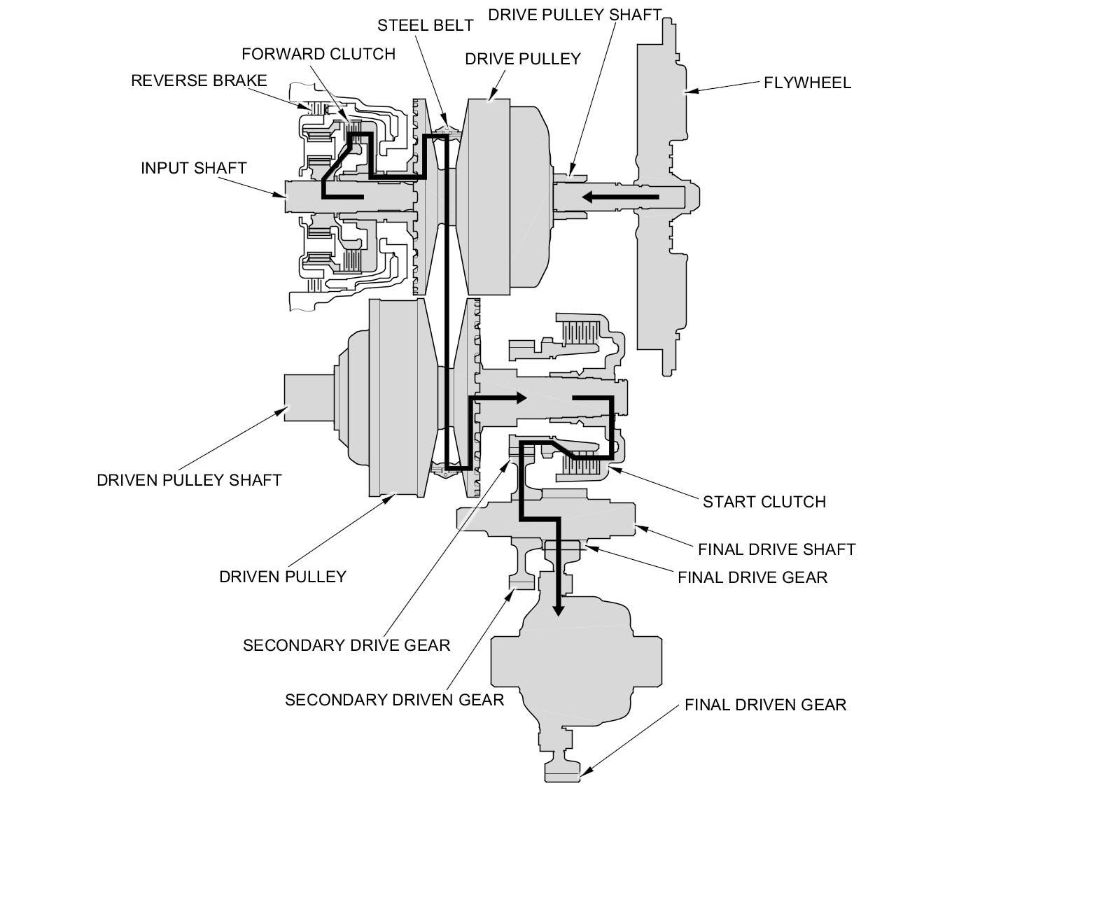 - The driven pulley shaft drives the secondary drive gear via the start clutch.