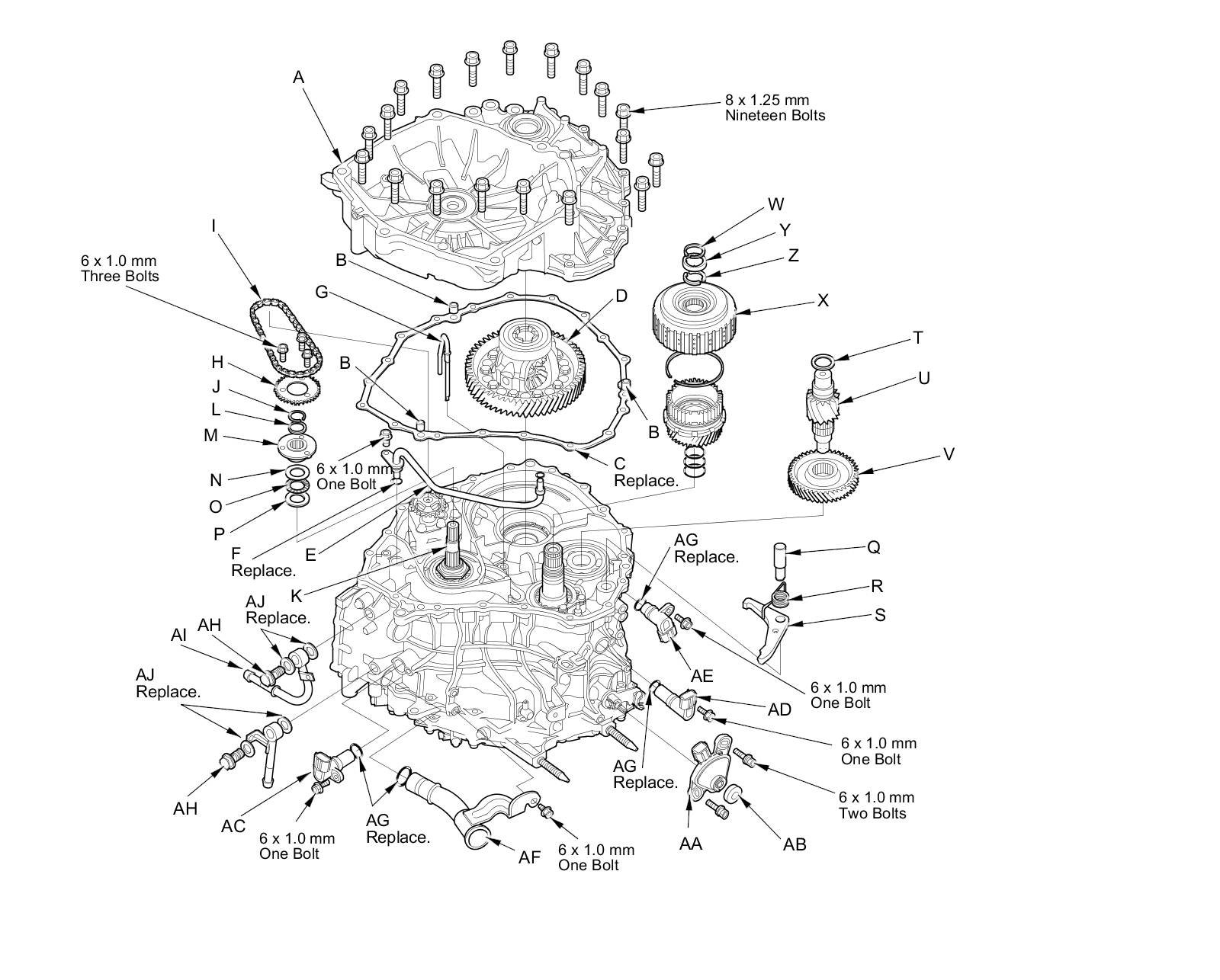 19. Remove the CVT input shaft (drive pulley) speed sensor (AC) (one bolt), the CVT output shaft (driven pulley) speed sensor (AD) (one bolt), the vehicle speed sensor (AE) (one bolt), and the dipstick tube (AF) (each one bolt), and remove the O-rings (AG).
