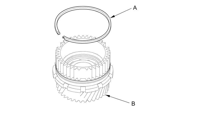 24. Remove the sealing ring (A) from the secondary drive/park gear (B), check it for rust, dirt, wear, or damage, and clean or replace it if necessary; it will be reinstalled on a new secondary drive/park gear when assembling the transmission.