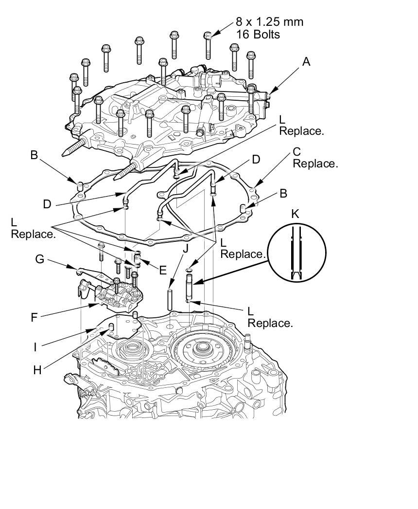 6. Remove the O-ring (J) from the CVTF strainer, and remove the O-ring (K) from the solenoid harness 8P connector. Install new ones when reinstalling the lower valve body.