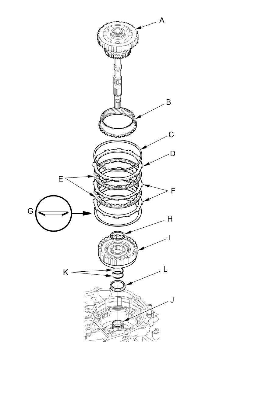 34. Remove the snap ring (H) securing the forward clutch (I) to the drive pulley shaft (J), then remove the forward clutch, the two O-rings (K), and the snap ring retainer (L) from the drive pulley shaft.