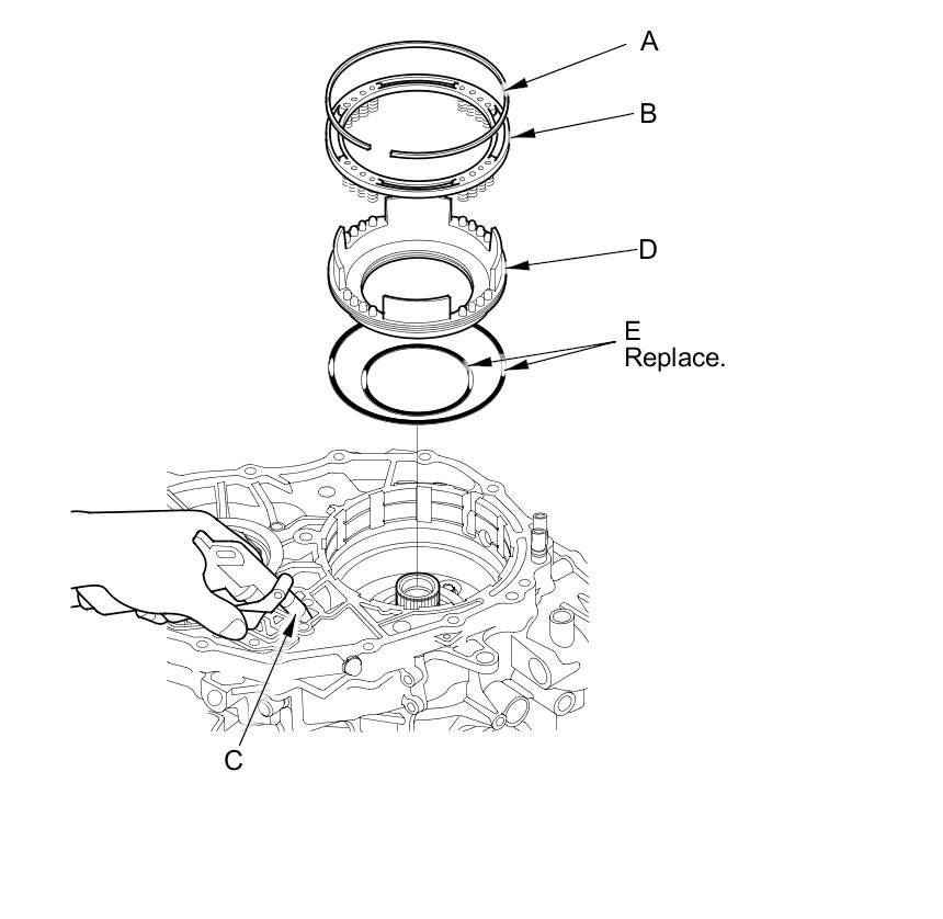 39. Apply air pressure to reverse brake pressure circuit hole (C) to remove the reverse brake piston (D), then remove the O-rings (E).