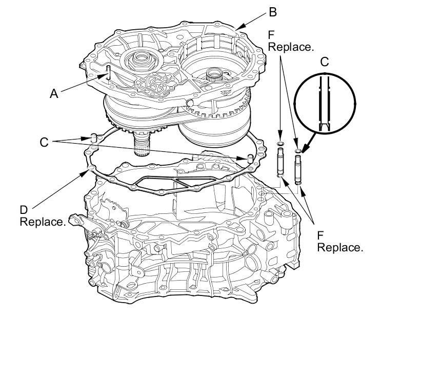 1. Remove the CVTF pan (A) (eighteen bolts), the two dowel pins (B), and the CVTF pan gasket (C).
