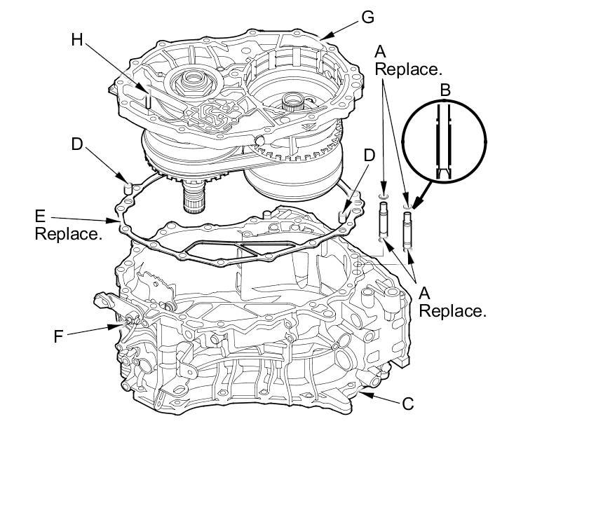 2. Install the two dowel pins (D) and a new gasket (E) on the transmission housing.