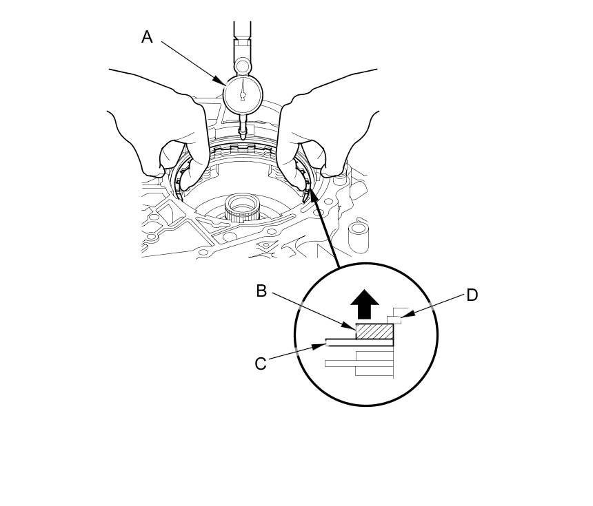 15. Zero the dial indicator by lifting the top disc (C) up against the reverse brake end-plate and the reverse brake end-plate up against the snap ring (D).