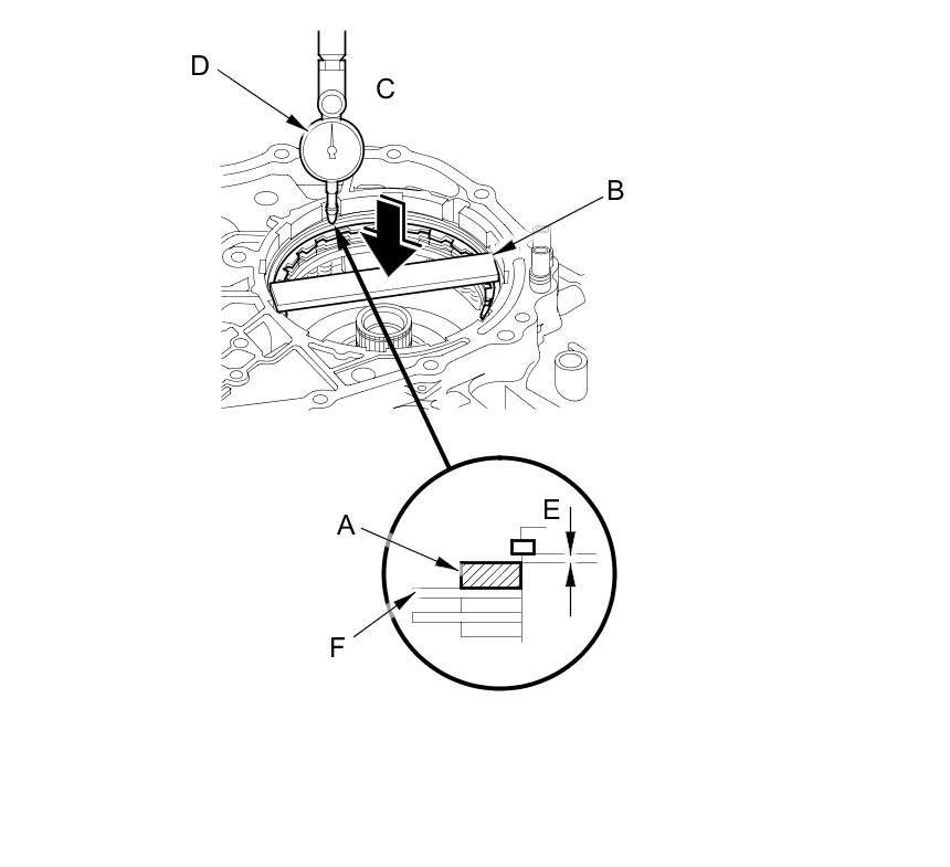 17. Press the steel plate down with 49 N (5 kgf, 11 lbf) (C) using a force gauge, and read the dial indicator (D). The dial indicator reads the clearance (E) between the reverse brake end-plate and the top-disc (F). Take measurements in at least three places, and use the average as the actual clearance.