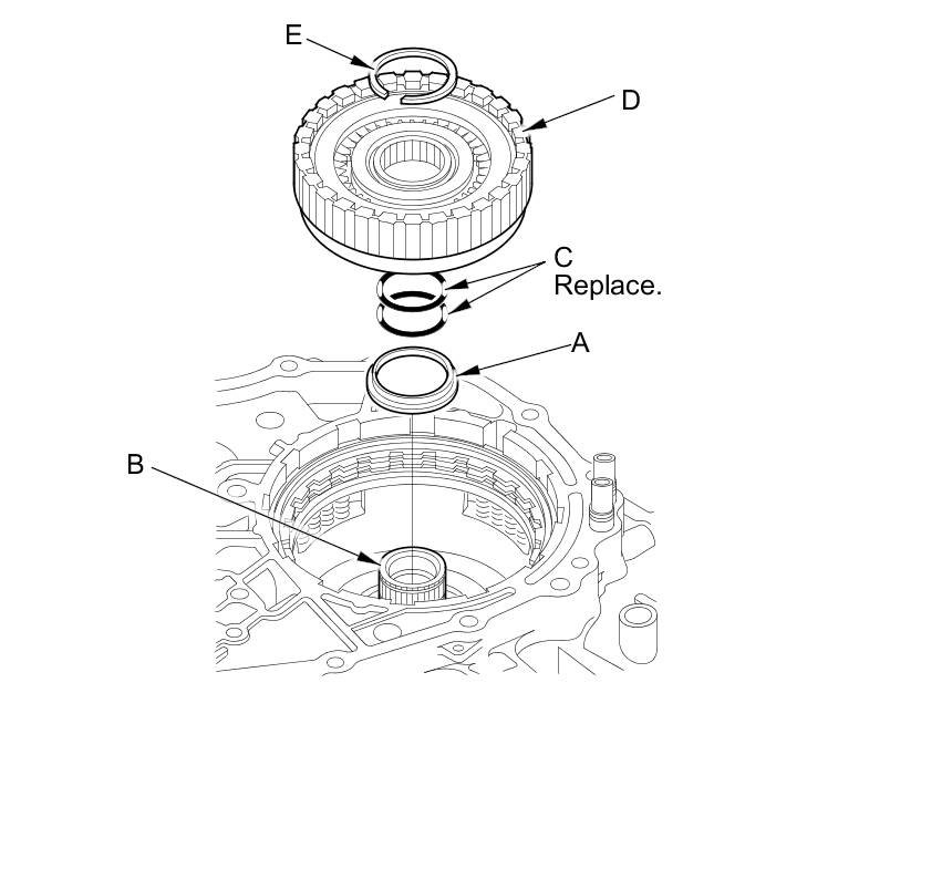 12. Starting with the two reverse brake plates (C), alternately install the two reverse brake plates and the reverse brake discs (D). Install the reverse brake end-plate (E), then install the snap ring (F).