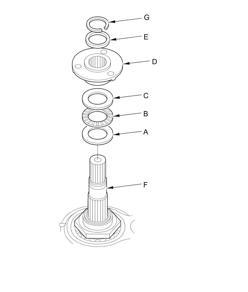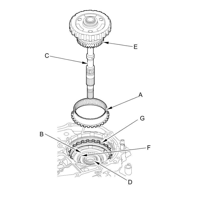 49. Install the thrust washer (A), the thrust needle bearing (B), the thrust washer (C), the CVTF pump drive sprocket hub (D), and the 22 x 28 mm thrust shim (E) on the input shaft (F), and install the snap ring (G) to secure them.