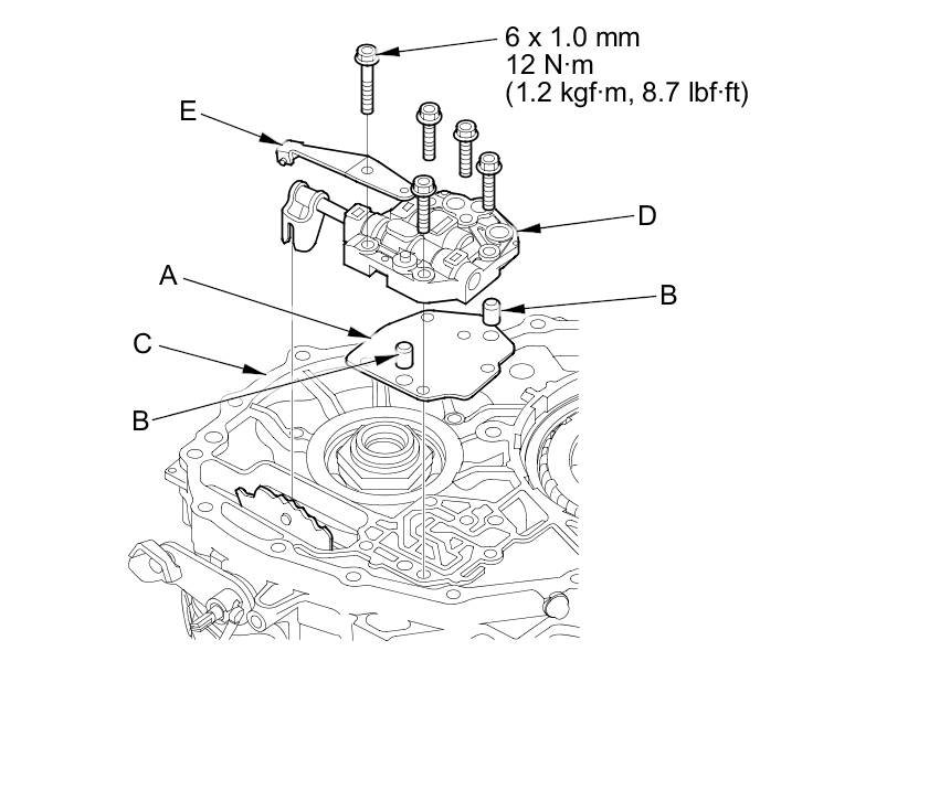 27. Install the manual valve body separator plate (A) and the two dowel pins (B) on the intermediate housing (C), then install the manual valve body (D) and detent spring (E).