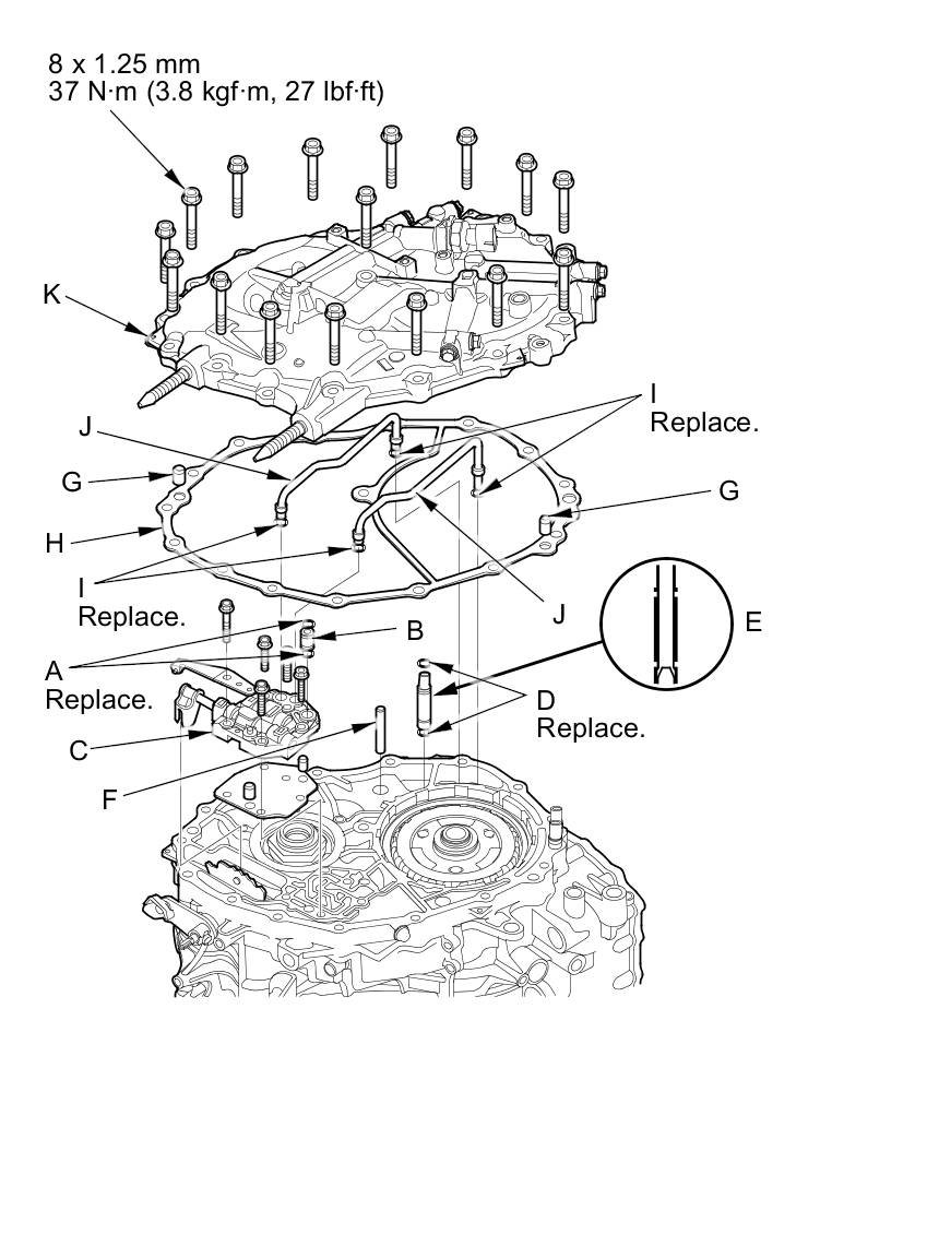 31. Install four new O-rings (I) on the two CVTF feed pipes (J), then install them on the manual valve body and the intermediate housing.