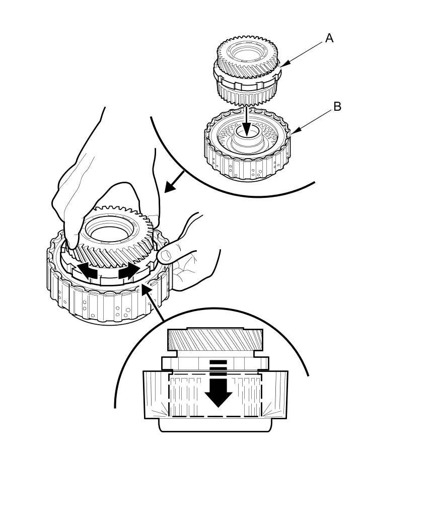 35. Insert the secondary drive/park gear (A) into the start clutch (B). Wiggle the secondary drive/park gear back and forth as it goes into the start clutch, and push in the secondary drive/park gear until it bottoms out.