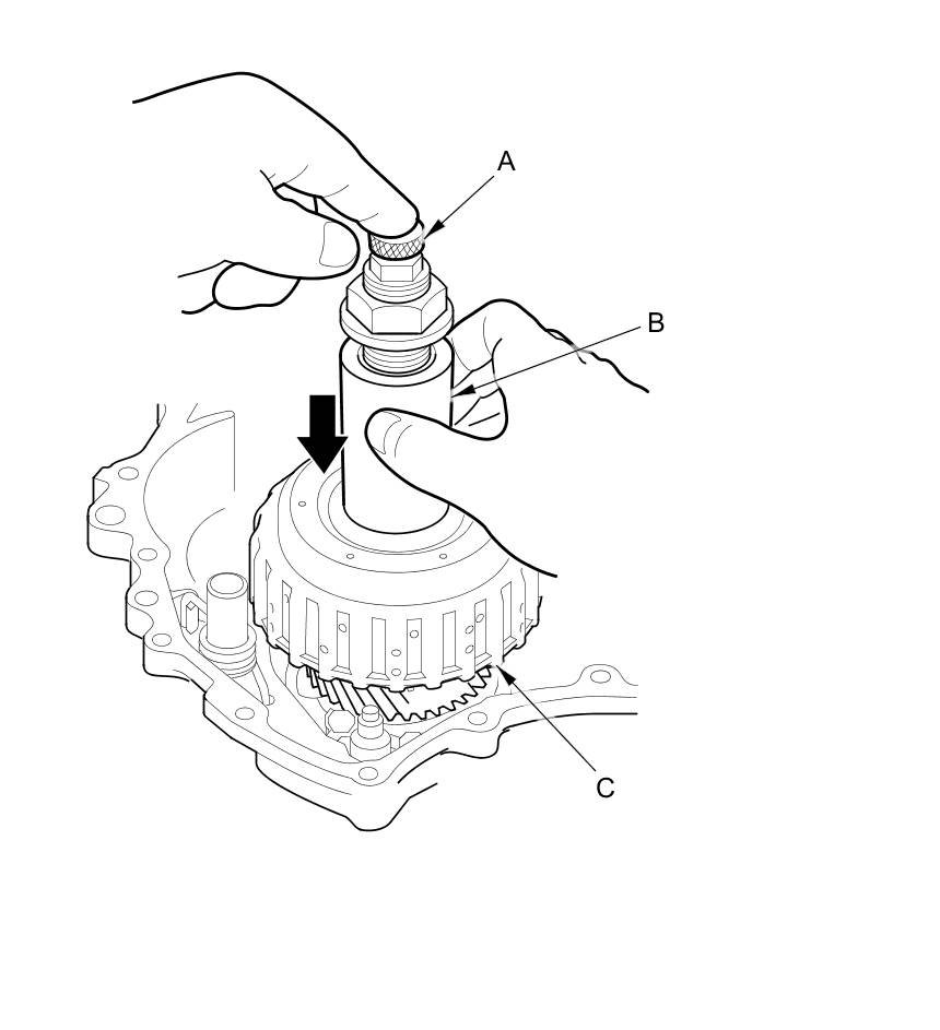 40. While holding the handle (A) down, push down the bottom part (B) of the start clutch installer until it contacts the seating surface of the start clutch (C).