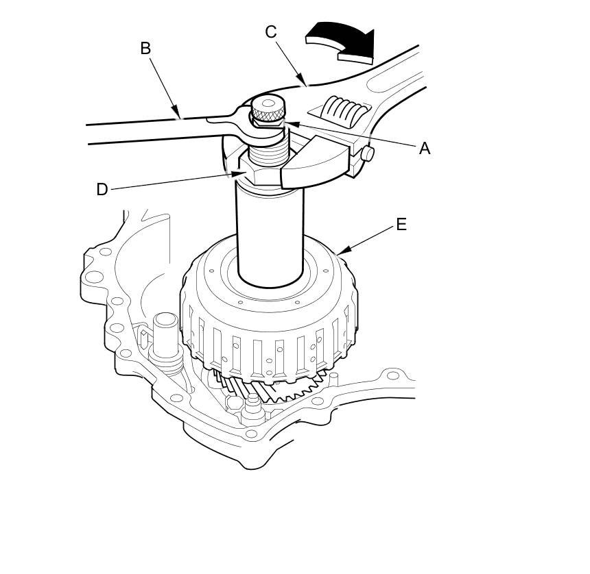 41. Hold the upper hex section (A) of the start clutch installer with a 19 mm wrench (B), then use an adjustable wrench (C) to tighten the start clutch installer's lower nut (D) until the start clutch (E) seats.