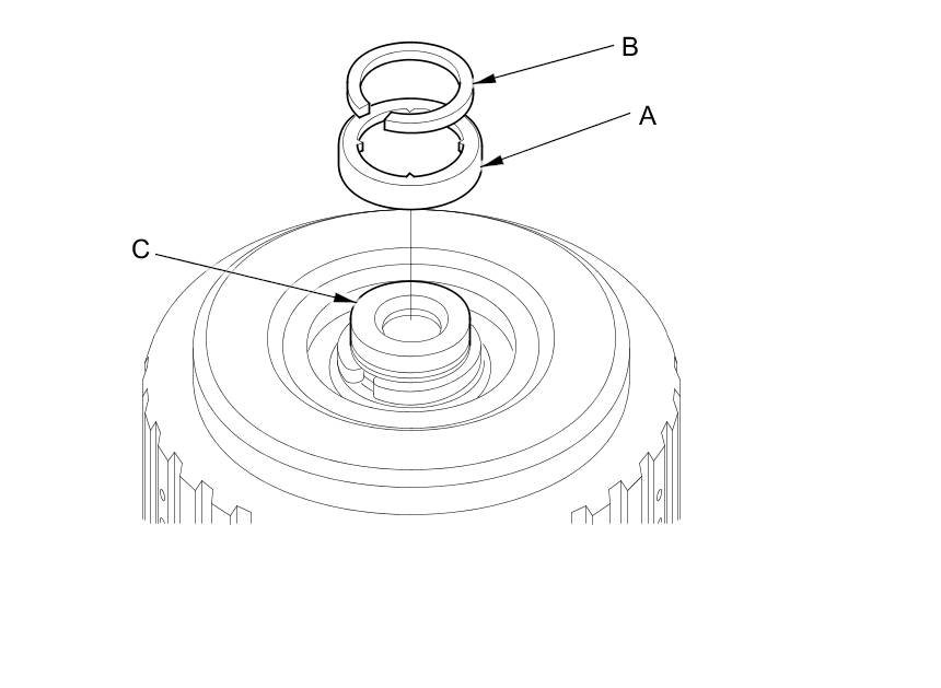 5. Install two new O-rings (A) on the reverse brake piston (B), then install the piston in the intermediate housing (C).