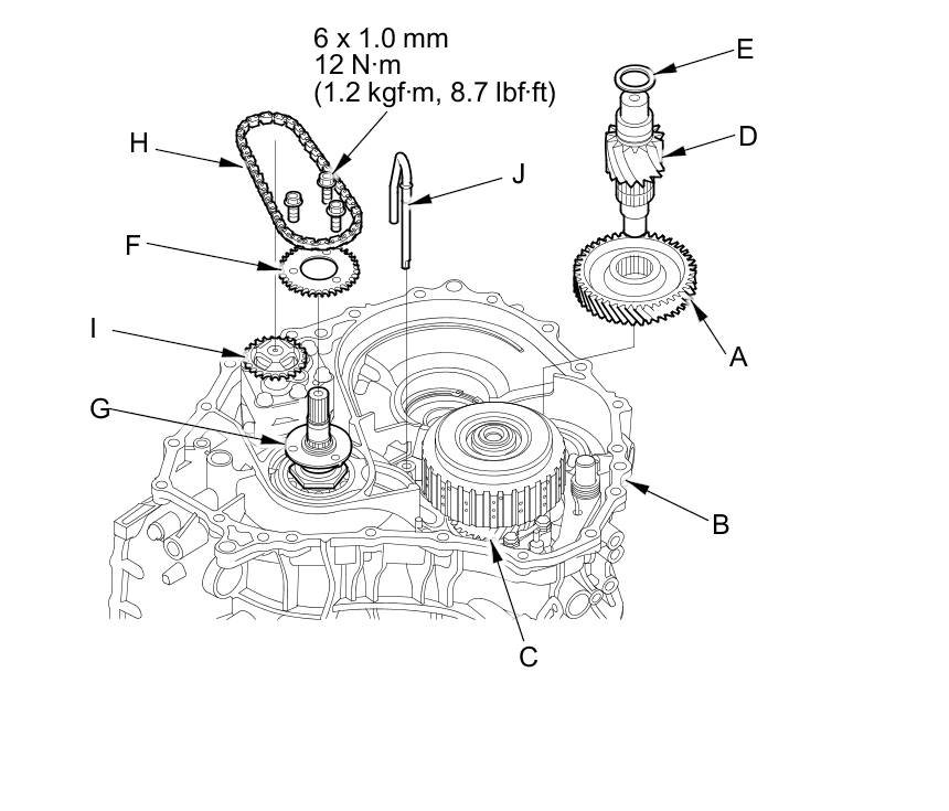 57. Position the CVTF pump drive sprocket (F) on the CVTF pump drive sprocket hub (G), and put the CVTF pump drive chain (H) on the CVTF pump drive sprocket and the CVTF pump driven sprocket (I), then secure the CVTF pump drive sprocket with the three bolts.