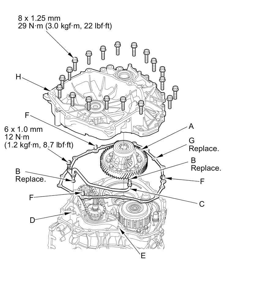 29. Install two new O-rings (D) on the 10.9 x 56 mm CVTF feed pipe (E), then install it with the filter end and an 8 mm CVTF pipe (F) in the intermediate housing.