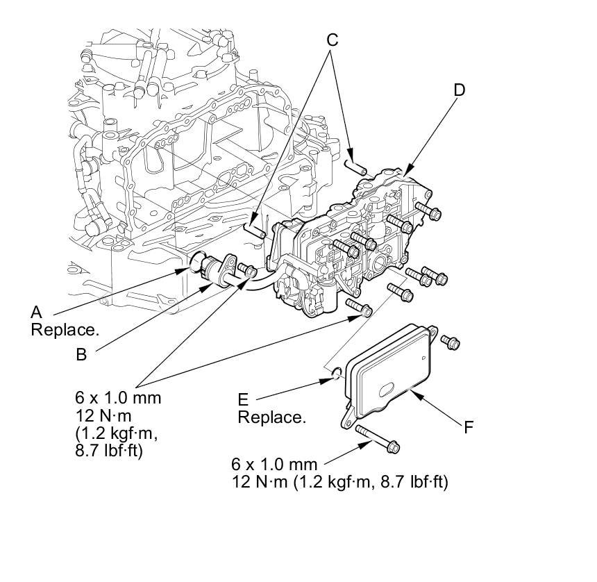 66. Install a new O-ring (E) on the CVTF strainer (F), then install the CVTF strainer (two bolts) on the lower valve body.