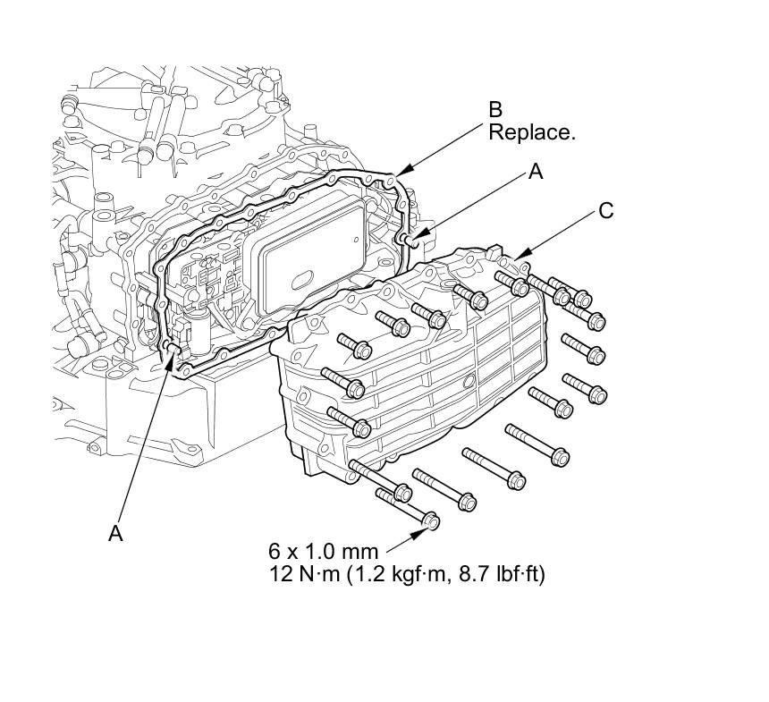 68. Place the CVTF pan (C) on the transmission housing.