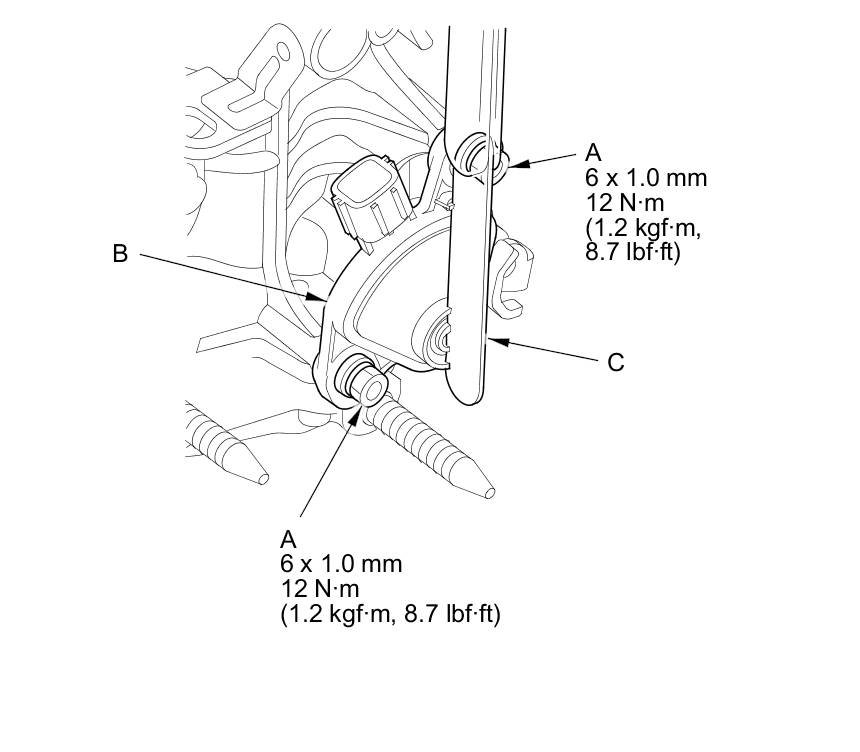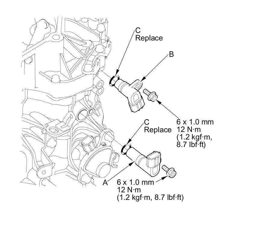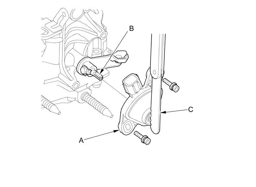 76. Install the CVT output shaft (driven pulley) speed sensor (A), and the vehicle speed sensor (B), with new O-rings (C).