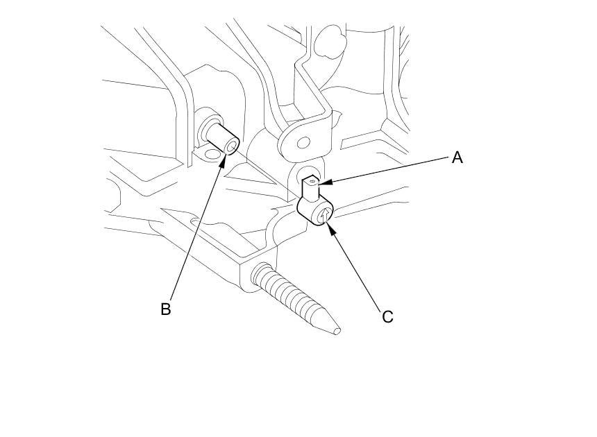 73. Tighten the bolts (A) on the transmission range switch (B) while you continue to hold it in the N position. Do not move the transmission range switch when tightening the bolts. Remove the feeler gauge (C).